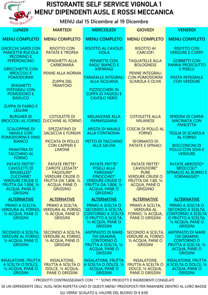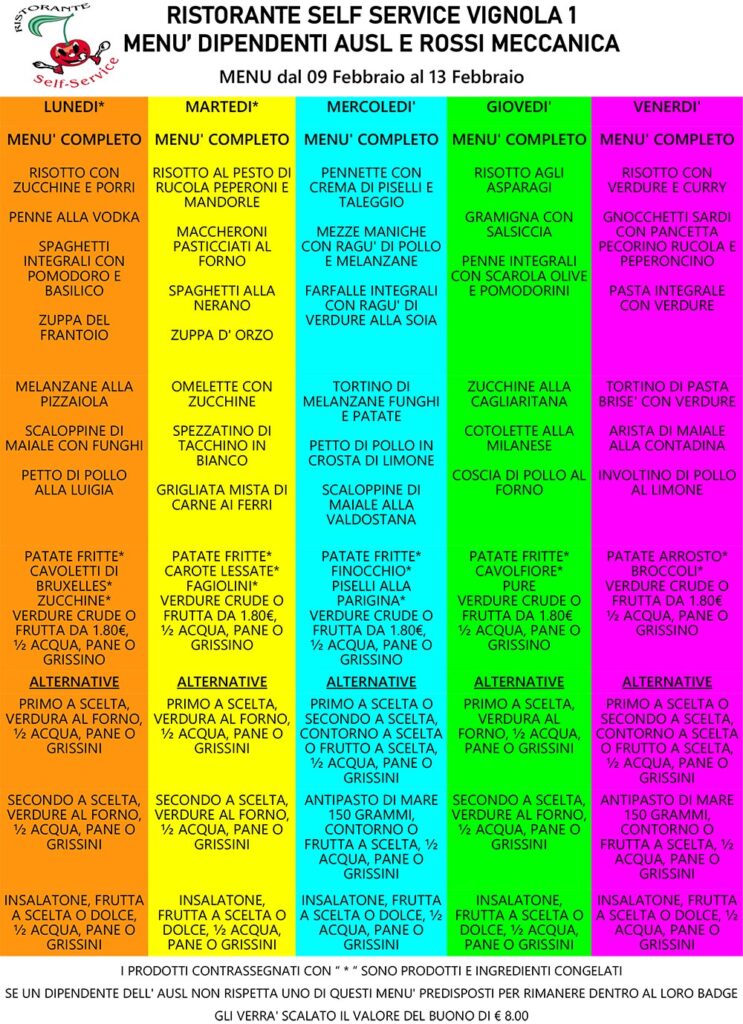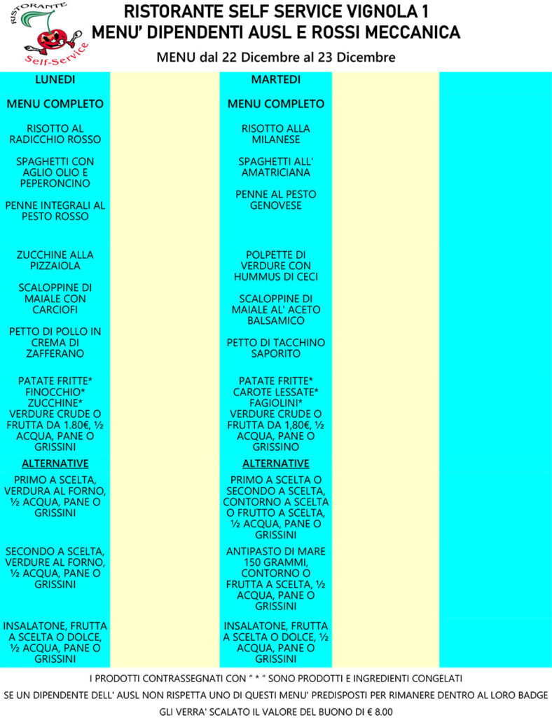 Si avvisano i Dipendenti Ausl che a partire dal 31 gennaio p.v.,causa nuovo contratto, aumenti energetici e delle materie prime, sono stati predisposti nuovi menu per non uscire dalla convenzione sia come menù completo che per le alternative a questo. Per semplificare la scelta Vi troverete un menù dedicato di seguito.